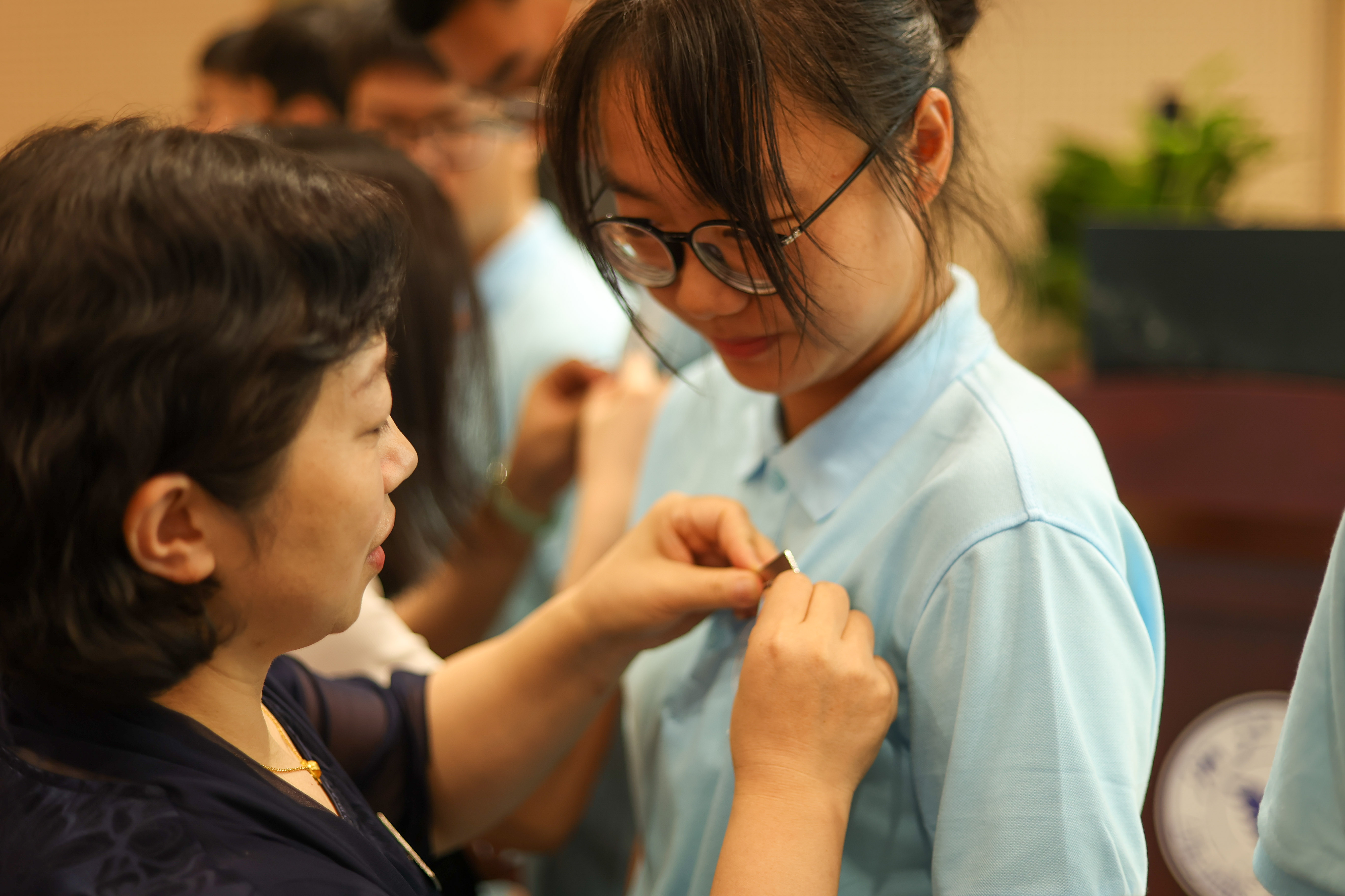 恰逢建校20周年校庆日,公司党委副书记汪洪老师简单介绍了建校历程和校庆事宜。大会安排“庆校庆、戴校徽”新生校徽佩戴仪式,在澎湃激昂的校歌声中,领导老师们给新生佩戴校徽,让师生共同感受作为宁理人的荣光。
