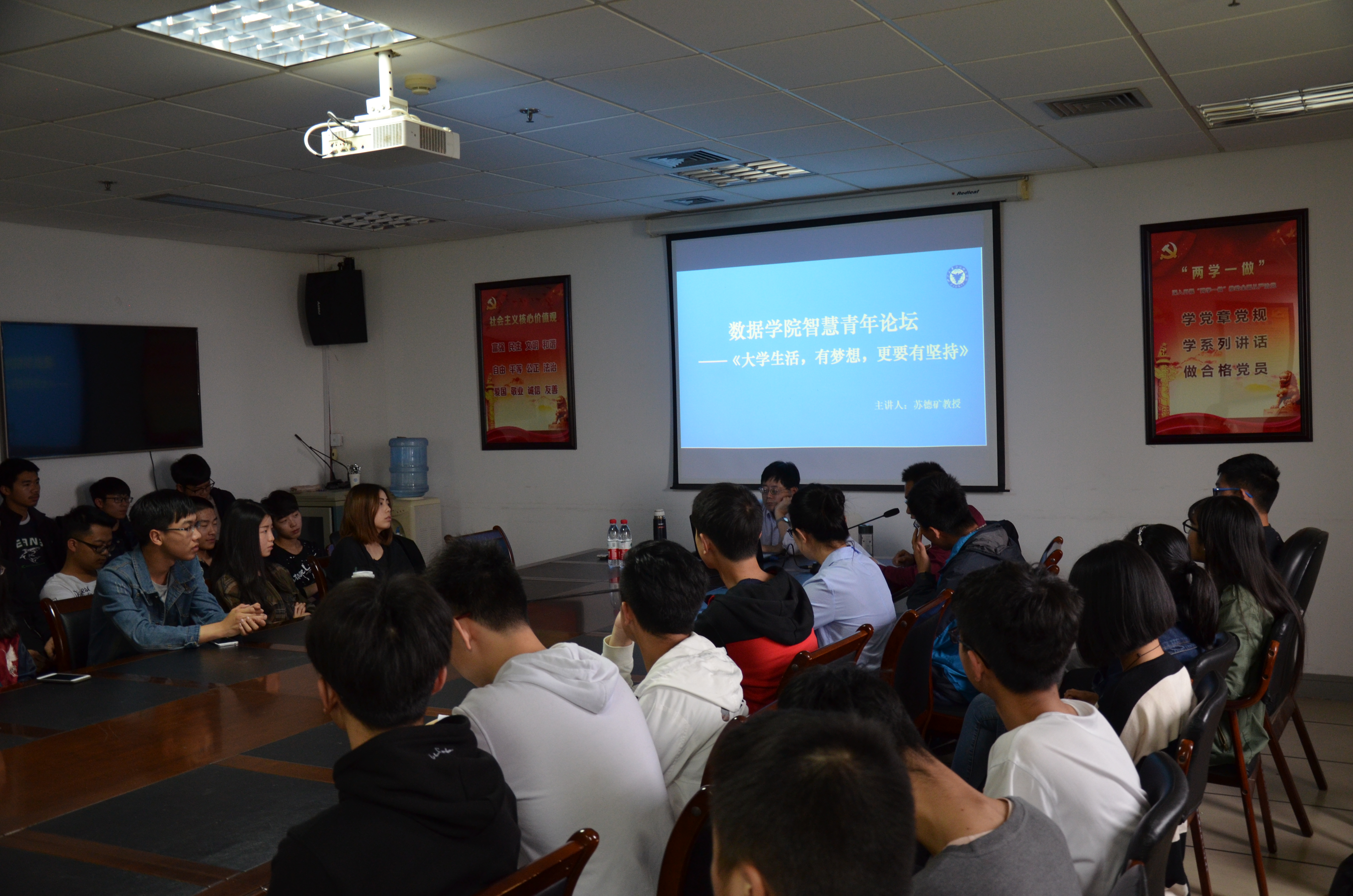 讲座第一项,由辅导员陈辉老师对苏德矿教授做了简单的介绍并做了简短的开头。讲座第二项,苏德矿教授以自己的亲身经历向大家传递正能量,分享了他个人的求学之梦、唱歌之梦、爱情之梦、教师之梦。他指出,大学是人生的关键阶段,这很有可能是最后一次可以用于学习的人生阶段;不要错过了这个好机会,要把握时机学好基础知识,在理论学好的基础上注重实践。苏德矿教授以个人的例子,绘声绘色地指导我们提升自身修养和人格魅力,多读书、多参加社会实践活动来丰富课余生活。并总结了多年的教学经验六字经“懂、透、精、趣、情、德”。现场气氛活跃,在场的同学们认真聆听、积极发言。本次讲座在同学们热烈的掌声中圆满结束。