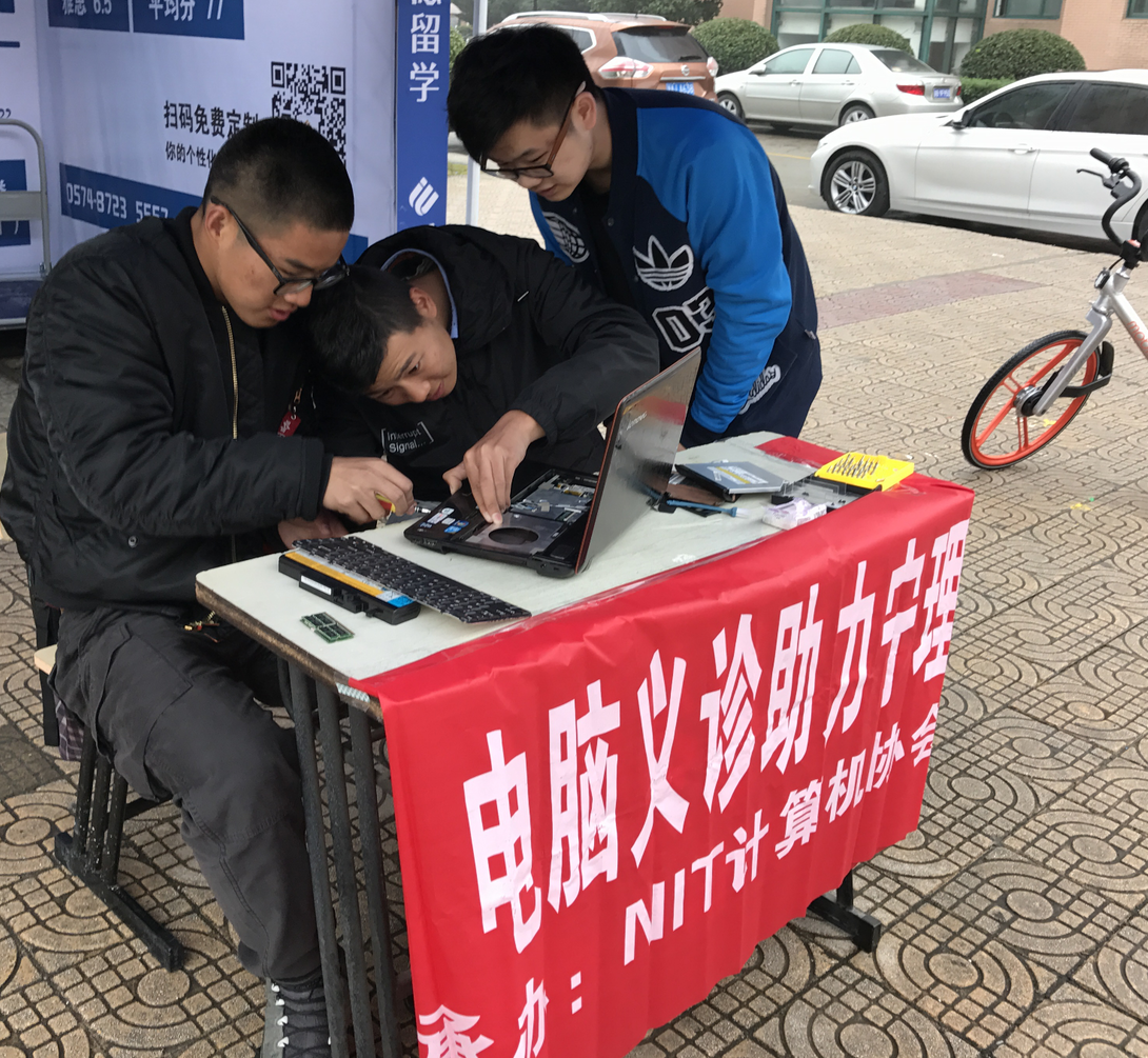 3月5日是学雷锋纪念日。为纪念雷锋同志、弘扬雷锋精神,william威廉英国官网志愿者们及计算机协会在两岸超市门口开展了科技校园行之电脑义诊活动。