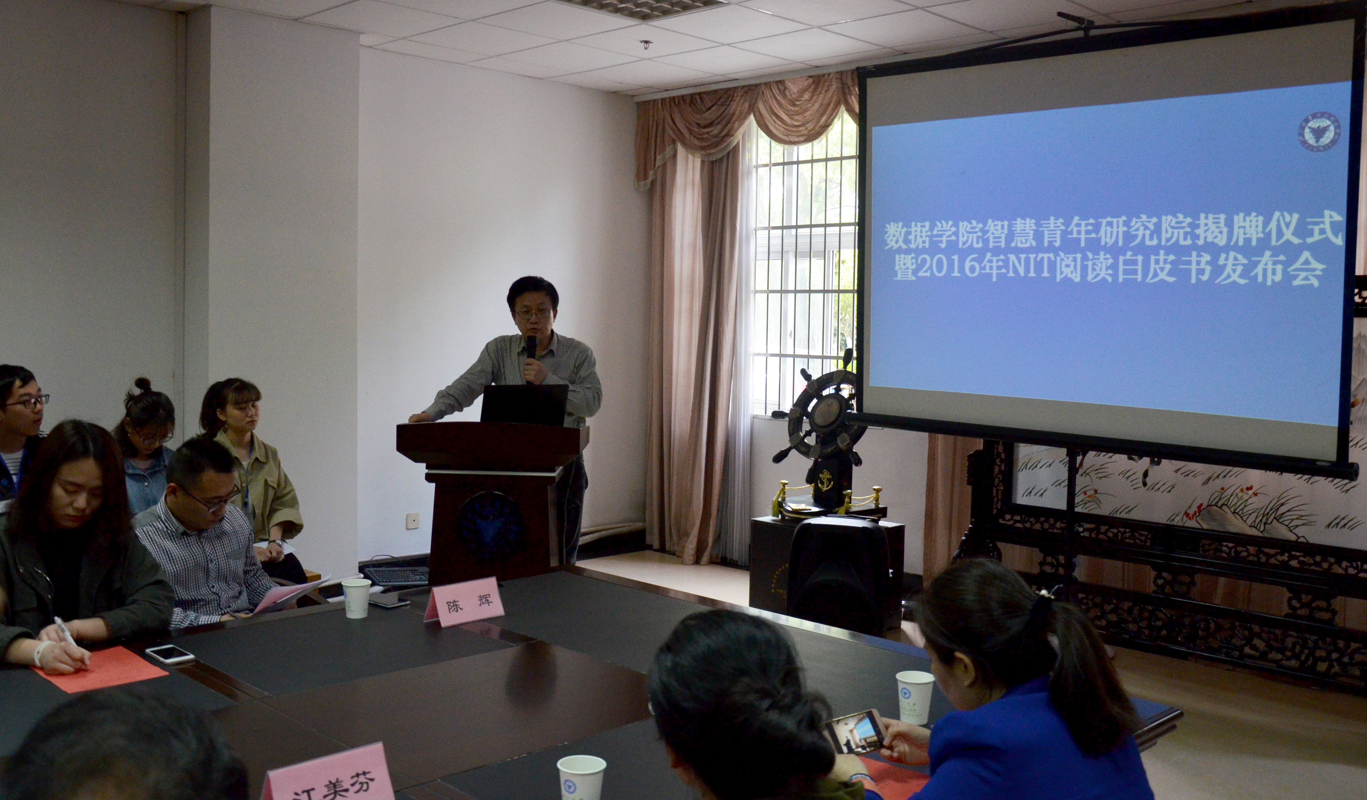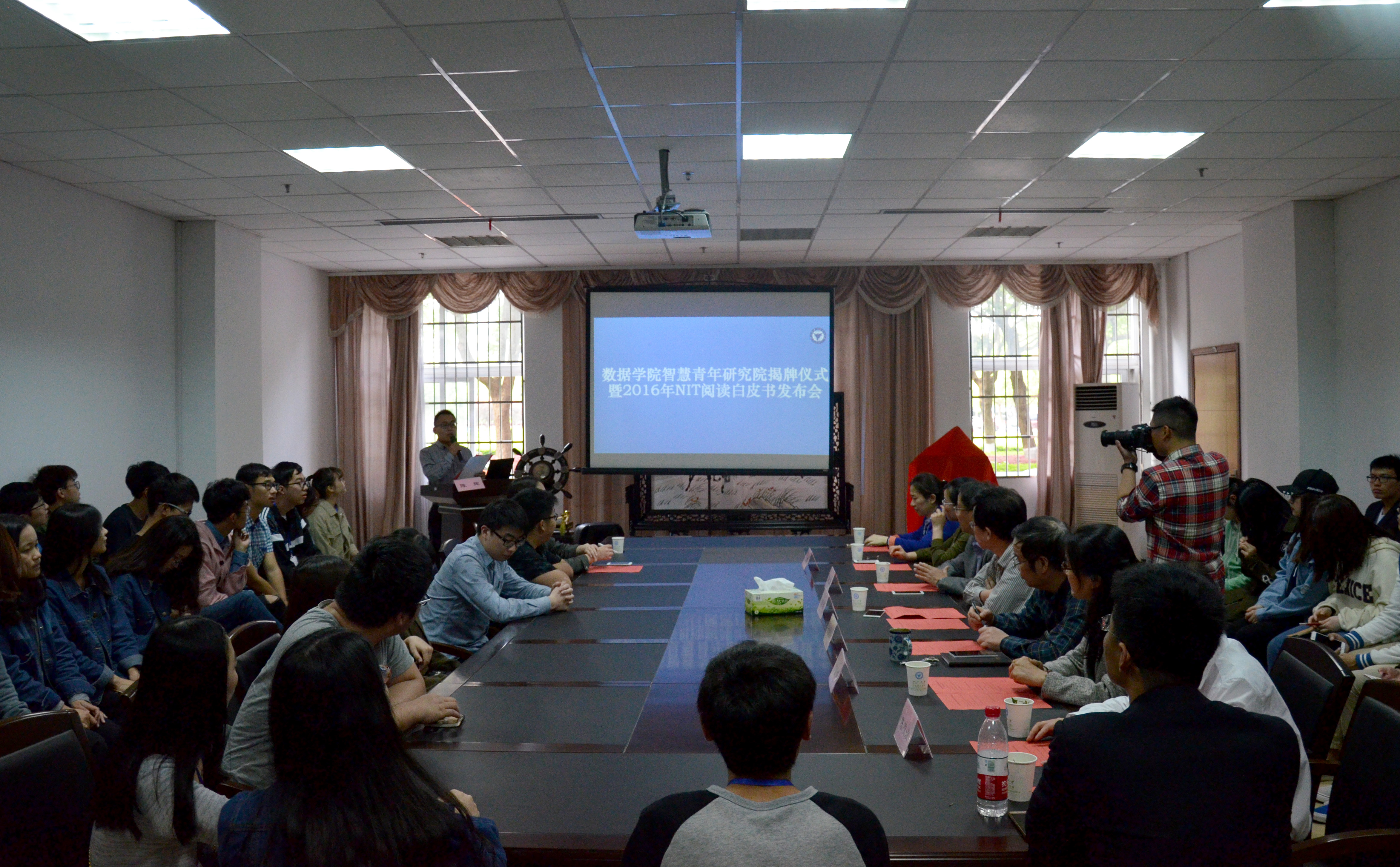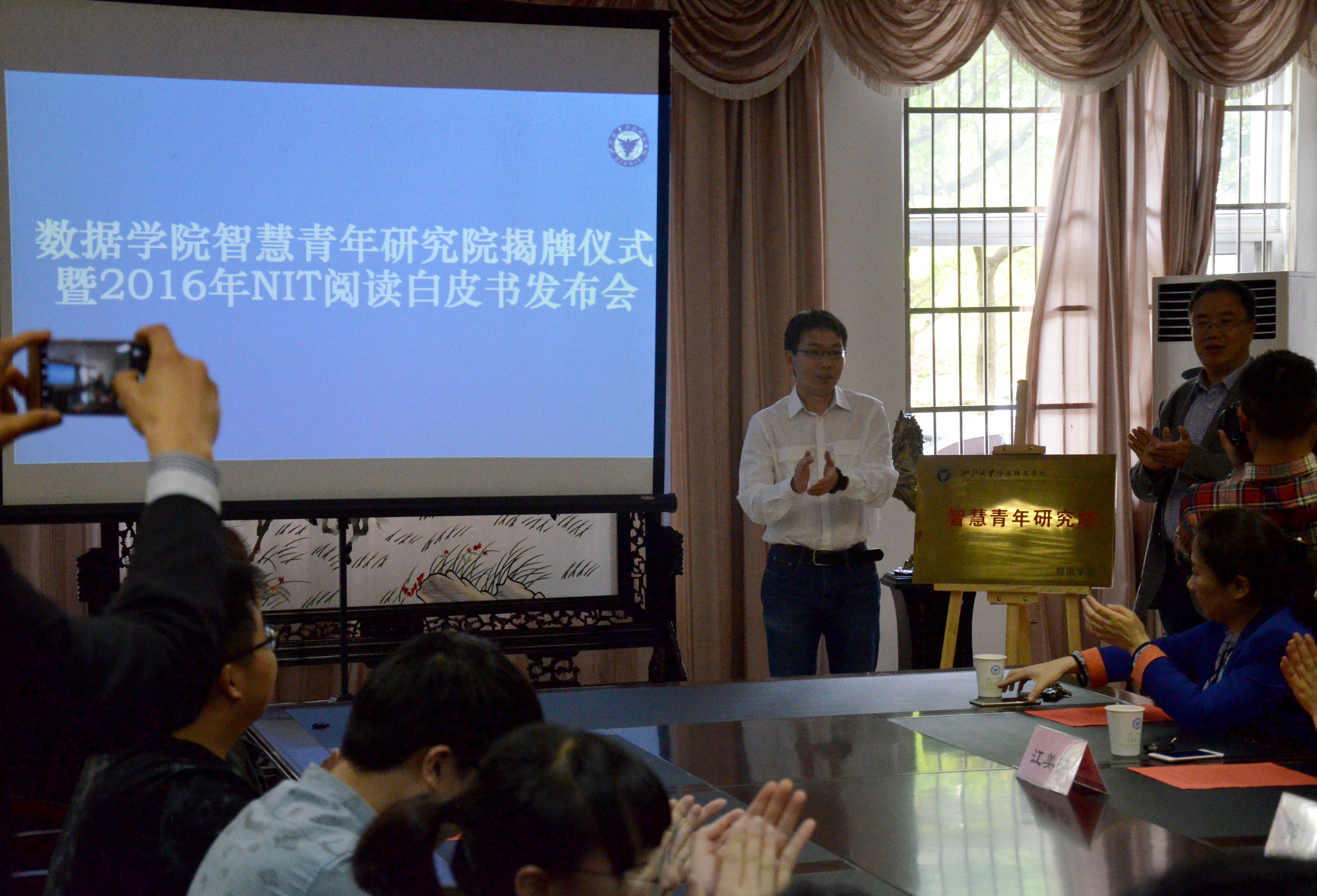 值2017年世界阅读日来临之际,智慧青年研究院与该校图书馆密切合作,由智慧青年团队完成了白皮书。随着方国娟老师按下发布按钮,2016年度NIT阅读白皮书在“数聚青年”公众号上完成了首发。智慧青年队员工代表姚敏佳做了白皮书解读,让大家进一步了解了白皮书的内容和信息。最后图书馆馆长赵继海老师进行了发言,对智慧青年团队做出的工作进行了肯定,并希望在接下来智慧青年研究院与图书馆进一步合作,在大数据分析和挖掘方面有更深入的研究。通过阅读白皮书发的发布,能使更多的师生关注阅读,爱上图书馆、爱上智慧。