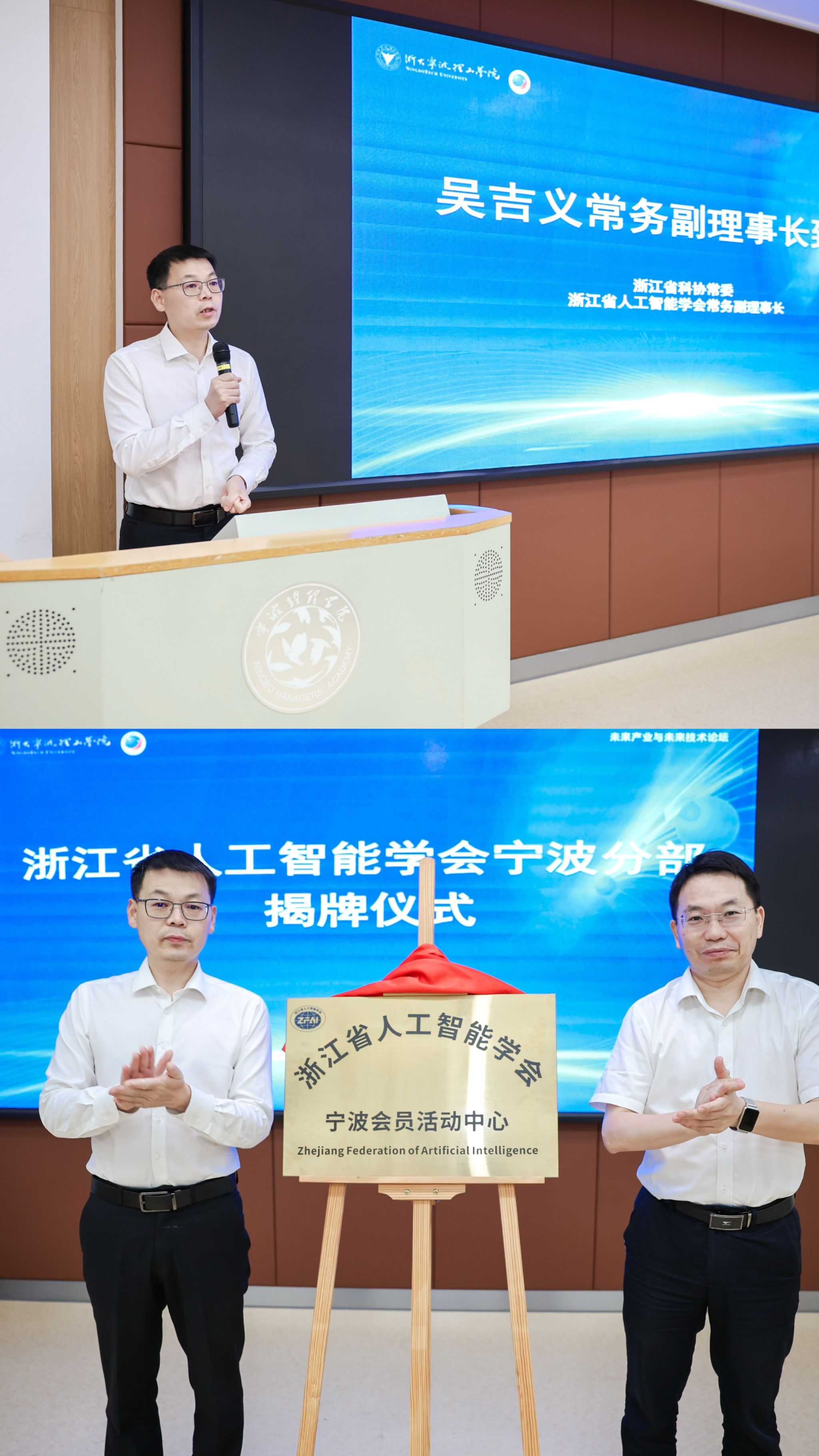 浙江省人工智能学会常务副理事长吴吉义致辞,宣布成立宁波会员活动中心。他与宁波会员活动中心主席陈根浪共同揭牌,为活动中心的委员颁发聘书。浙江省人工智能学会宁波会员活动中心的成立,旨在通过完善组织架构夯实技术协作、人才培育的产业服务基础。