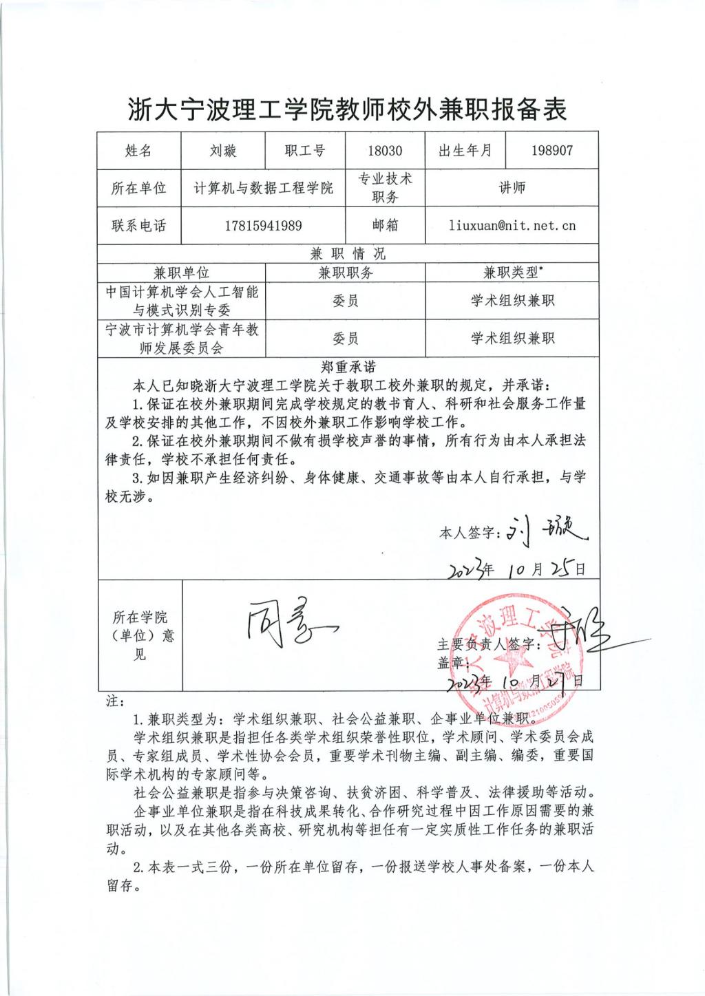 根据《william威廉英国官网教职工校外兼职管理暂行办法》(浙大宁理人〔2021〕235号),经10月27日人力资源委员会审查同意,现将教职工刘璇校外兼职情况公示如下: