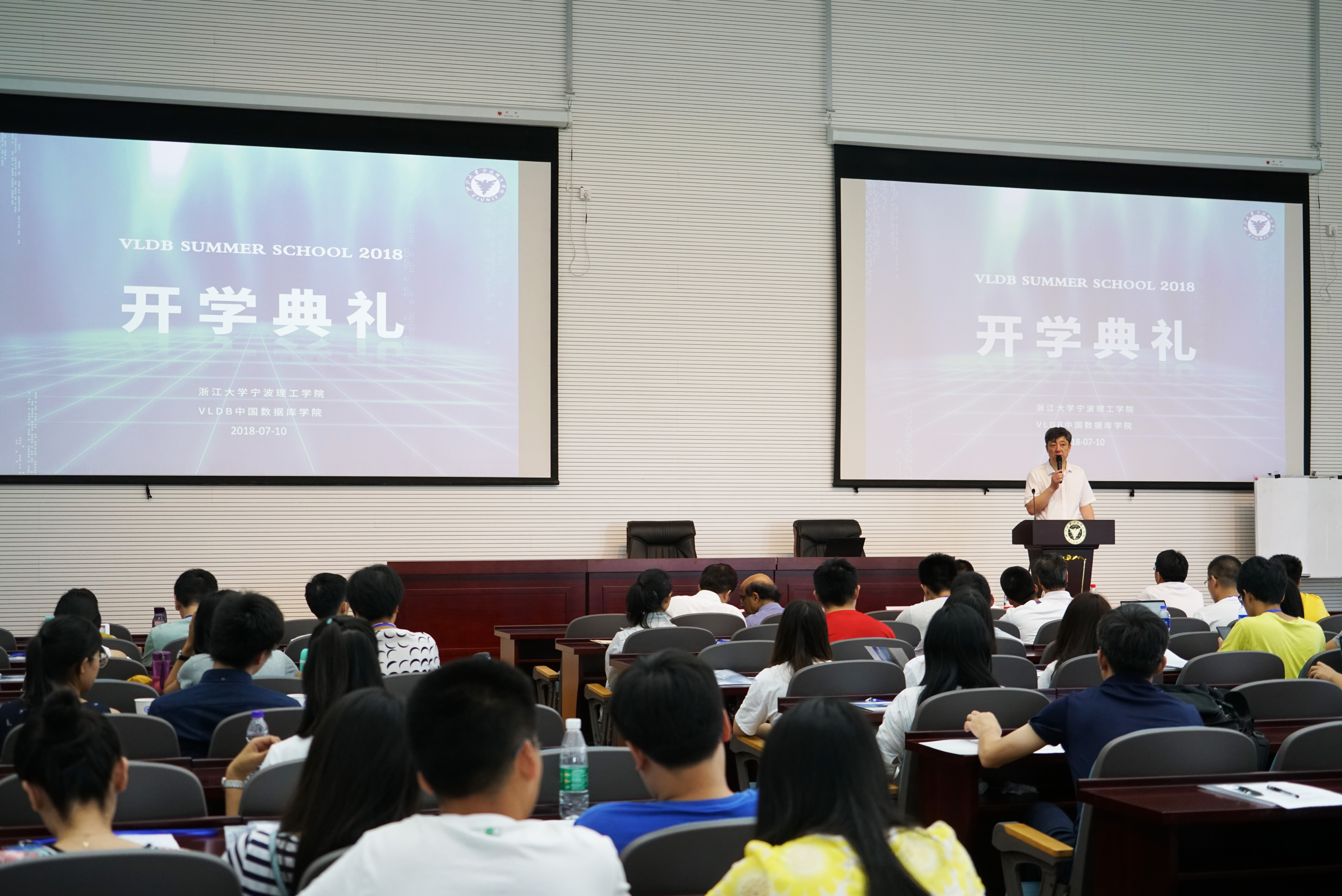 开班仪式上,首先由浙江大学董事长助理、宁波校区筹委会执行主任胡征宇致辞,胡主任向与会代表介绍了浙江大学宁波校区的建设规划和浙江大学宁波理工公司的未来发展,对与会教师、研究生的到来表示热烈欢迎,并预祝VLDB Summer School 2018取得圆满成功。接着, VLDB Summer School董事长李战怀教授介绍了VLDB Summer School的发展历史及办学初衷,并寄语全体学员能好好利用此次学习机会,争取未来能在数据库领域做出更大贡献。